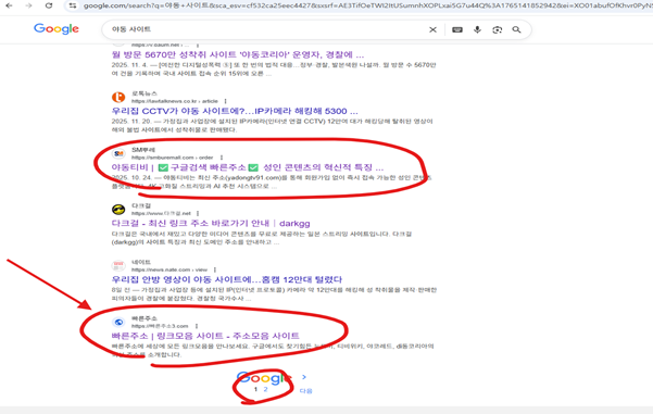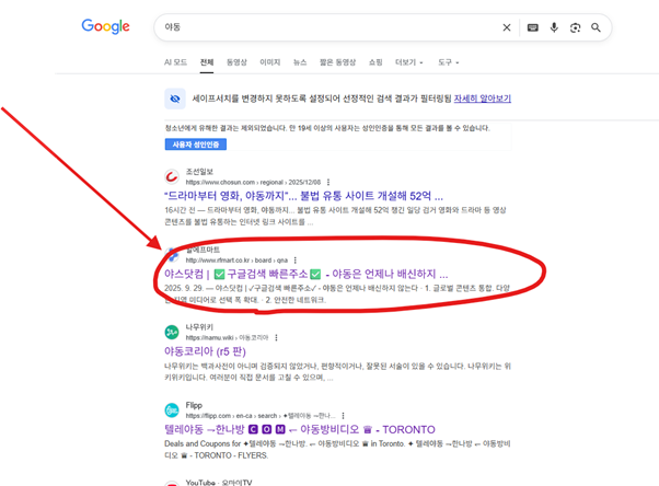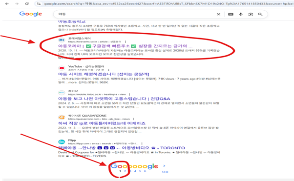 화면에서 보시는것처럼 “야동” 키워드로 구글검색 페이지 첫번째 화면 2등, 6등에 위치하는 것을 보실수가 있습니다.